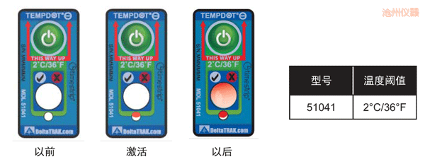 TempDot™ Minus標簽需存儲在室溫下,并且必須在反應(yīng)溫度 以上被激活。激活是通過用手指推壓,標簽 底部的小窗口變?yōu)榧t色或部分變紅色以指示激活,但激活后并不需要保持紅色。當使用了上述反應(yīng)溫度 標簽的產(chǎn)品暴露于閾值以下的溫度,,白色的大窗口變?yōu)榧t色或部分紅色,在反應(yīng)溫度 以上將溫度標簽用 于產(chǎn)品。如果一個產(chǎn)品暴露于閾值以下的溫度,白色的大窗口變紅色或部分紅色,,TempDot™ Minus標簽 提供即時的視覺指示。為達到最佳效果,,標簽應(yīng)保持垂直位置,其反應(yīng)期間,,紅色箭頭須指向上方。